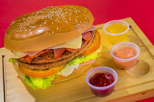Carne de res, Jamón de cerdo, Queso, Tomate, Lechuga, Pan de hamburguesa